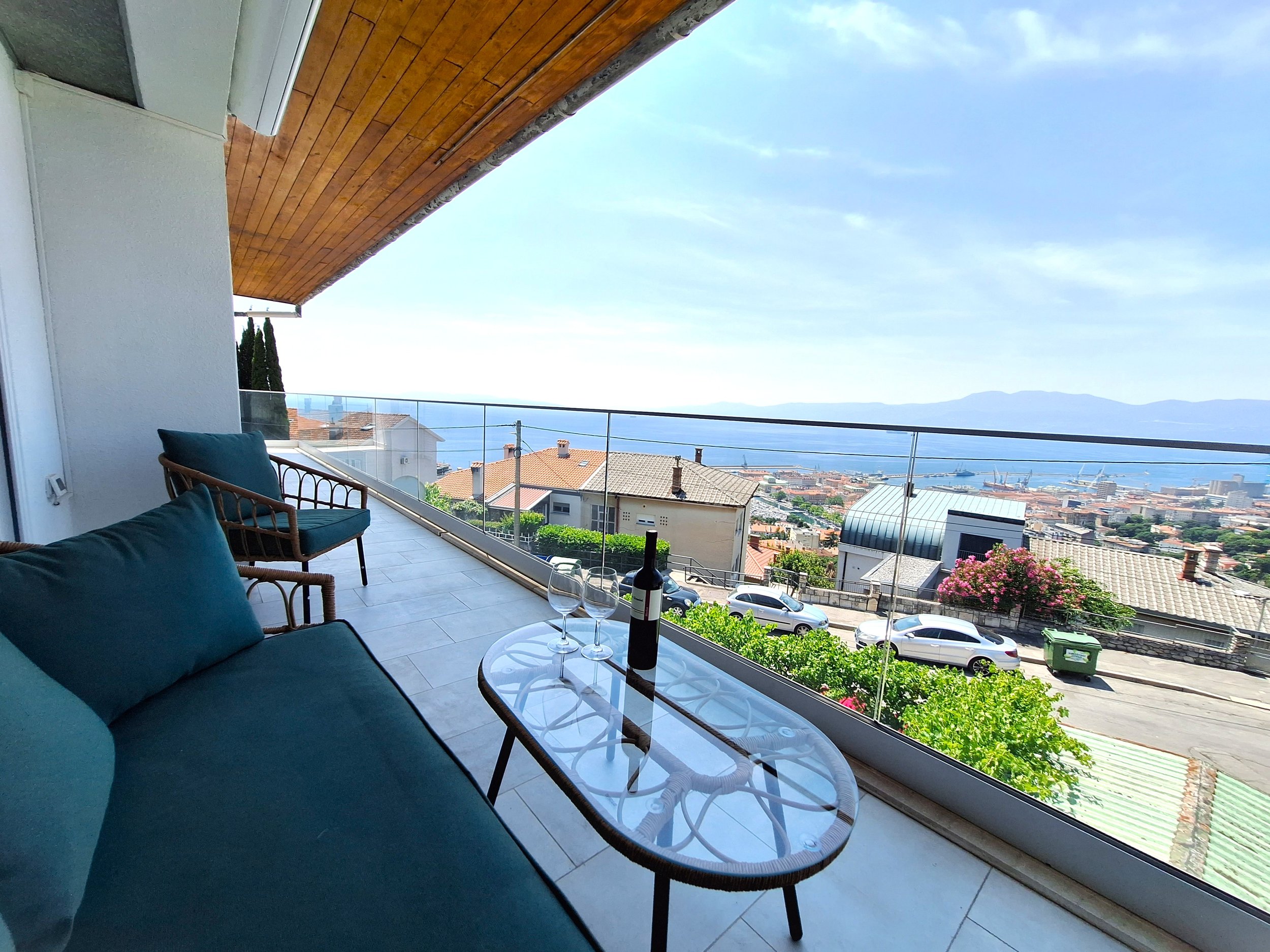 Overlooking the entire Rijeka city and Kvarner Bay, with a long balcony and a 180 degree sea view from every bedroom.